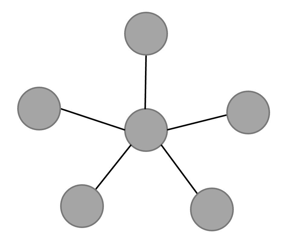 스타(start, 성형) 토폴로지는 중앙에 있는 노드에 모두 연결된 네트워크 구성을 말한다.