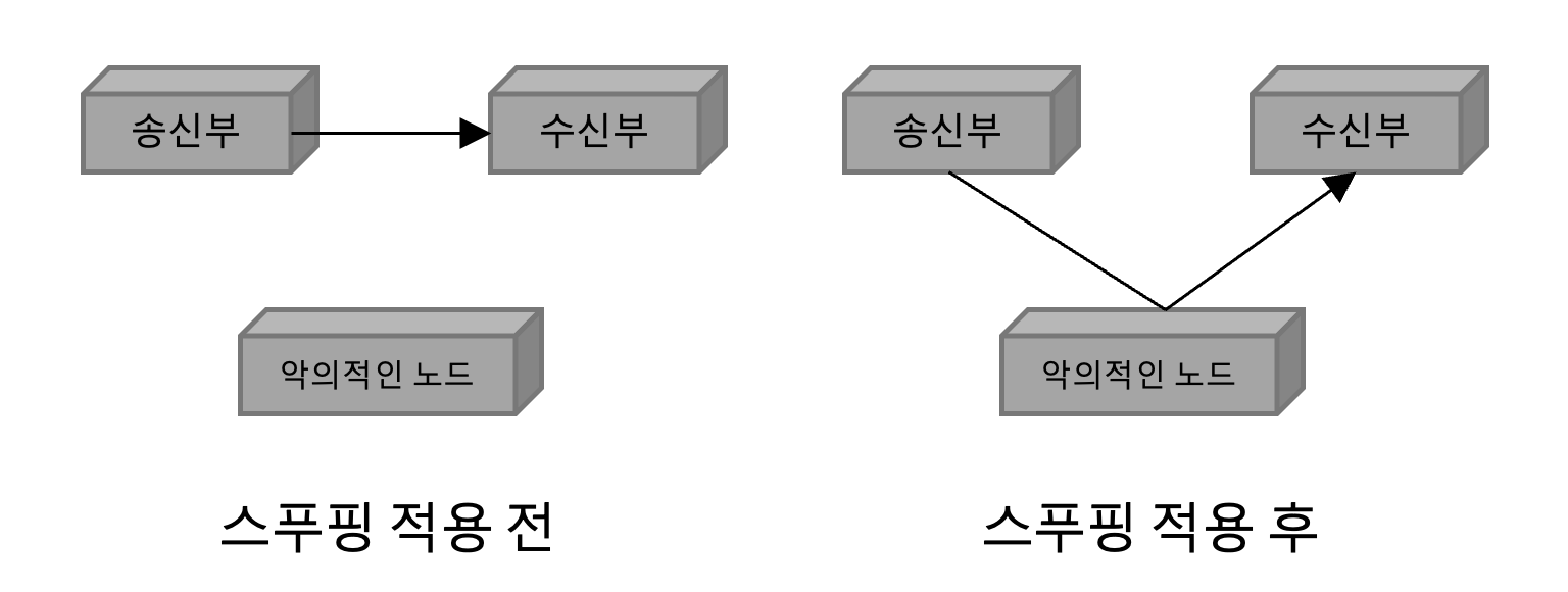 위의 그림처럼 스푸핑을 적용하면 올바르게 수신부로 가야 할 패킷이 악의적인 노드에 전달되게 된다.